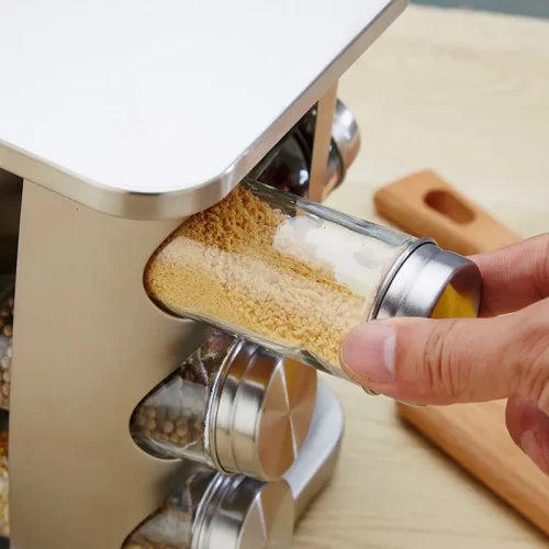 Rotirajući držač za začine je savršen alat za organizaciju vaše kuhinje i lakšu pripremu obroka. Ovaj inovativni držač omogućava vam da sa lakoćom pronađete pravi začin zahvaljujući rotirajućoj bazi i staklenim teglicama koje možete organizovati po sopstvenim željama.
