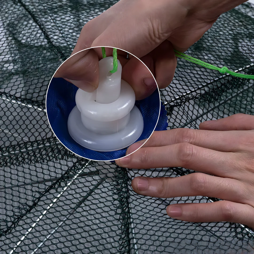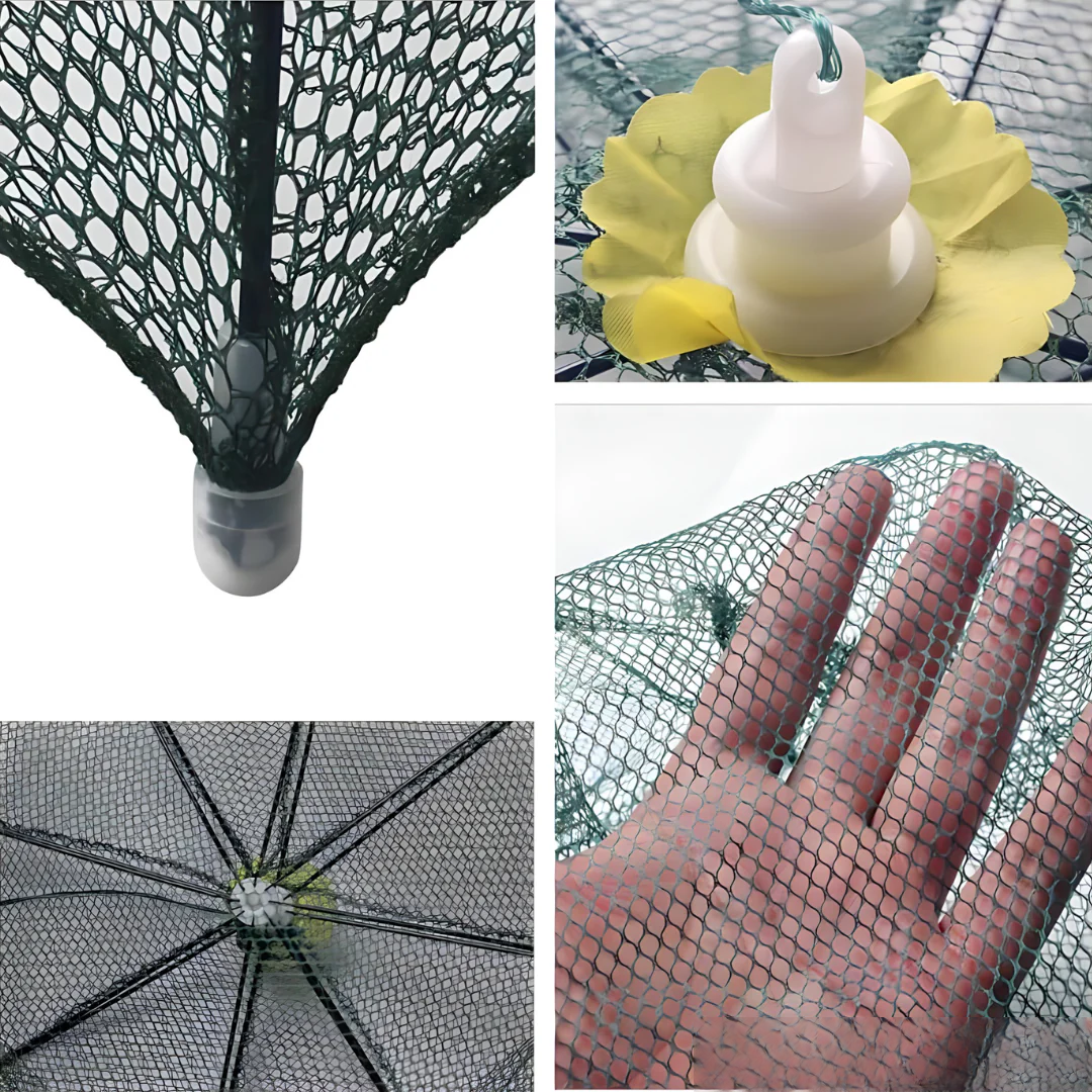 Možete dodati i mamac u sredinu mreže kako biste dodatno privukli plen. Zbog položaja ulaza i oblika zamke, ulov ne može da izađe nazad, što garantuje visoku efikasnost.