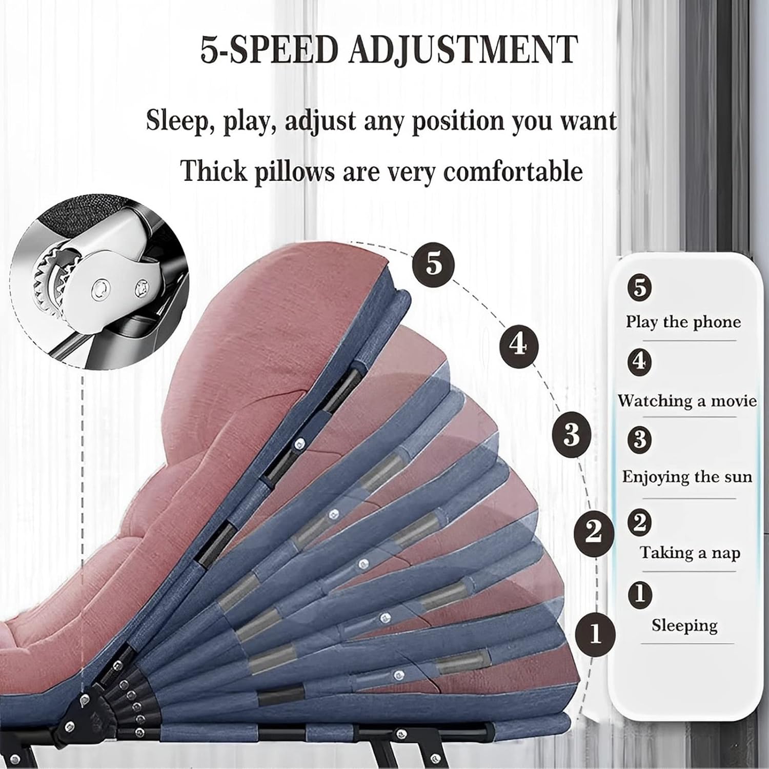 Ovaj krevet nudi pet pozicija podesivog sistema zaključavanja, omogućavajući vam da sedite, zavalite se ili ležite ravno, prema vašim potrebama.